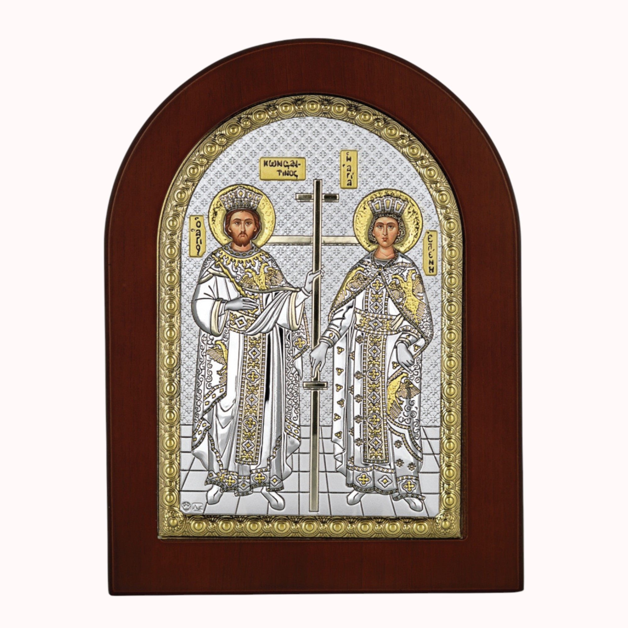 Εικόνα Άγιοι Κωνσταντίνος και Ελένη σε ασημί με χρυσή απόχρωση και καφέ ξύλο. Η εικόνα διαθέτει ξύλινη βάση για να τοποθετηθεί σε επιφάνεια και υποδοχή για να κρεμαστεί στον τοίχο. Οι Άγιοι Κωνσταντίνος και Ελένη συμβολίζουν την έλευση και εδραίωση του Χριστιανισμού στη Ρωμαϊκή Αυτοκρατορία. Ο συμβολισμός τους περιλαμβάνει την πίστη, την ίδρυση του Χριστιανικού κράτους, την απονομή δικαιοσύνης και την ειρήνη.