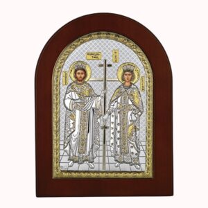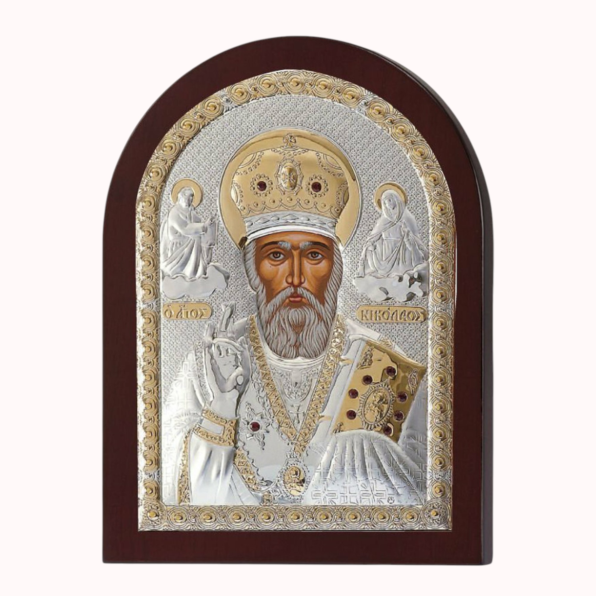 Εικόνα Άγιος Νικόλας σε ασημί με χρυσή απόχρωση και καφέ ξύλο. Η εικόνα διαθέτει ξύλινη βάση για να τοποθετηθεί σε επιφάνεια και υποδοχή για να κρεμαστεί στον τοίχο. Ο Άγιος Νικόλαος συμβολίζει την προστασία των ναυτικών, την ευημερία και την ελπίδα, αλλά και την φιλανθρωπία. Είναι γνωστός ως ο προστάτης των ναυτικών, με αναφορές σε πλοία και ταξίδια, ενώ η μορφή του συνδέεται και με τη γιορτή του Άγιου Βασίλη λόγω της φήμης του για τη γενναιοδωρία προς τα παιδιά.